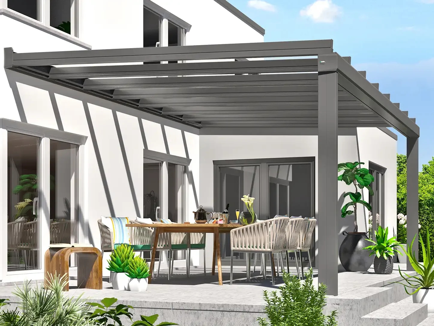 Erleben Sie Designvielfalt auf höchstem Niveau: Wählen Sie zwischen einer elegant gerundeten oder modern kubischen Formgebung – beide Terrassendach-Varianten vereinen zeitlose Optik mit innovativer Technik. Auf Wunsch erhalten Sie Ihr Dach auch als Integral-Ausführung mit nahtlos integrierter Entwässerung für eine besondere, stilvolle und saubere Ästhetik ohne sichtbare Regenrinnen.
