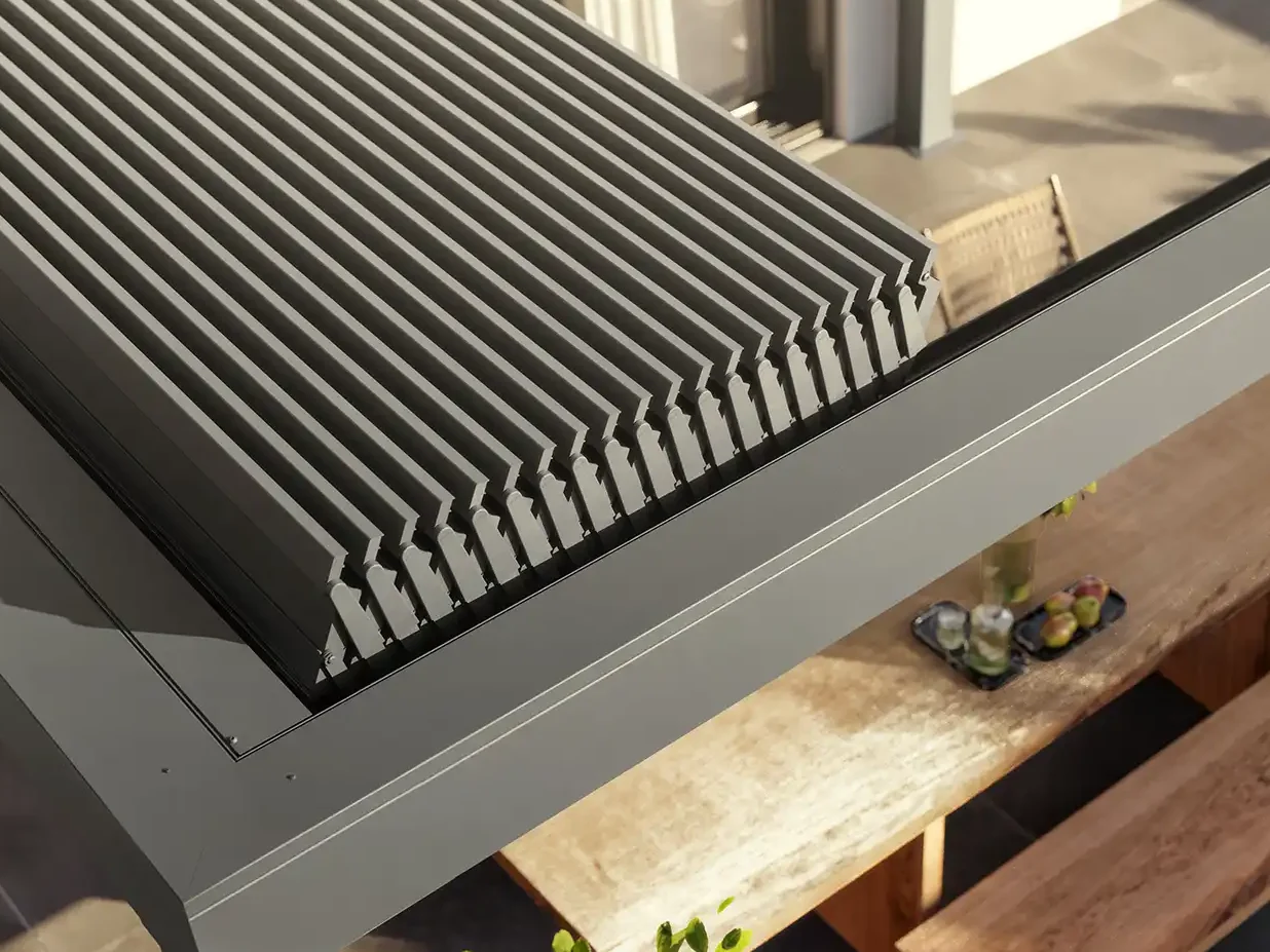 Das Qube Skyline überzeugt als stilvolles Lamellendach mit auffahrbaren Aluminiumlamellen, hoher Wetterfestigkeit und umfangreichen Ausstattungsoptionen wie Beleuchtung oder Glasschiebeelementen. Ideal für alle, die modernes Design und hohe Funktionalität kombinieren möchten.