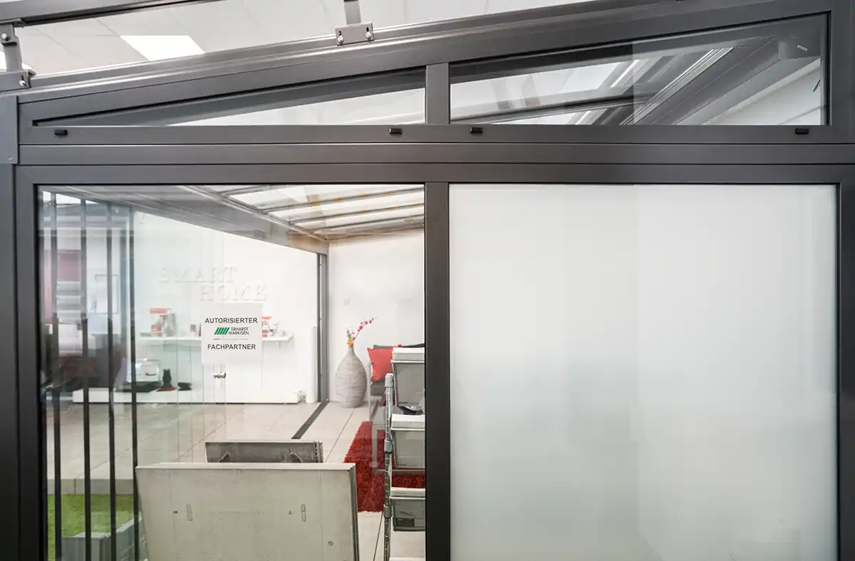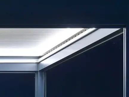 - Verfahrbarer Textilbehang aus Acryl- oder Polyesterstoff, der sich über den gesamten Fahrbereich der Überdachung regulieren lässt