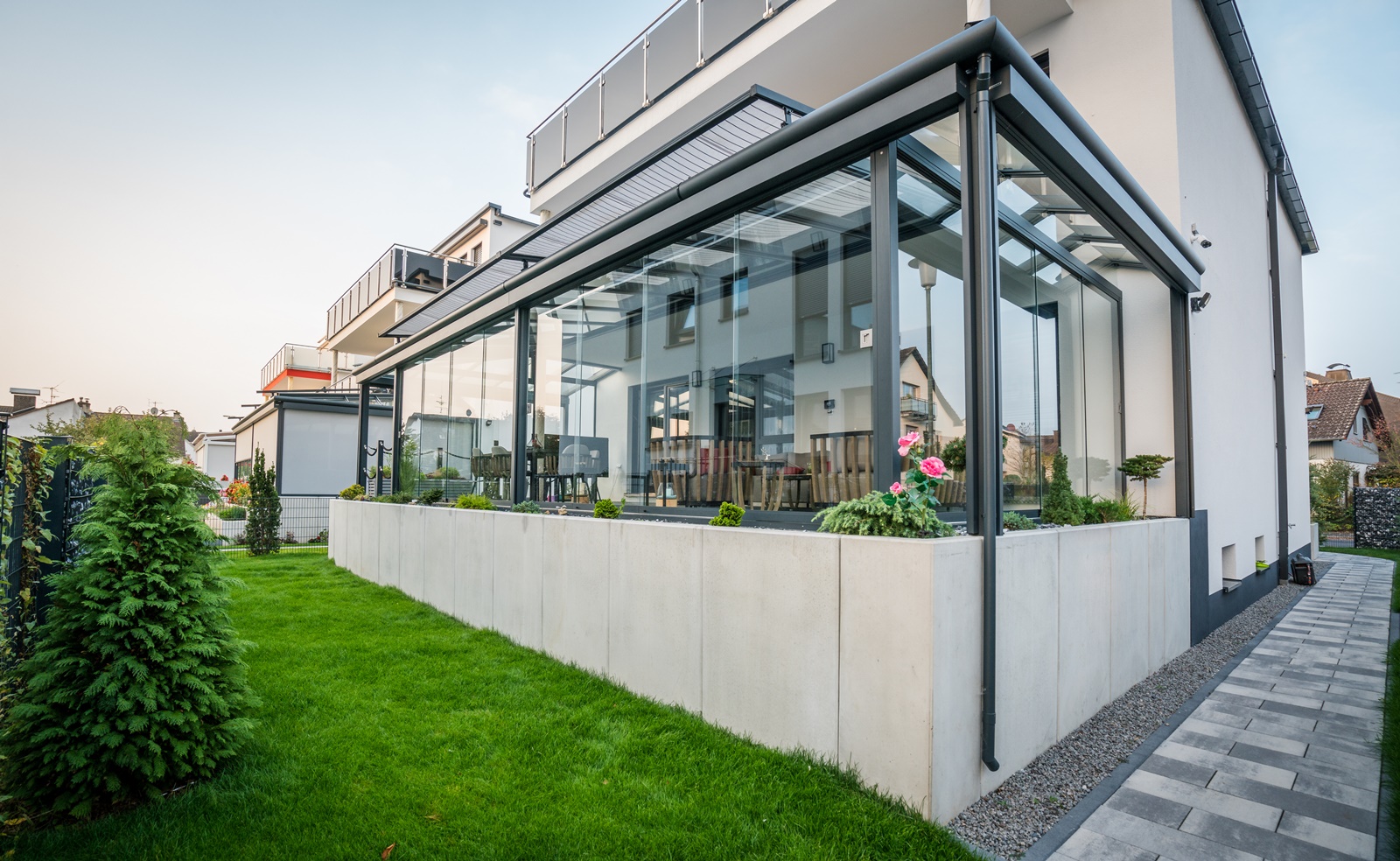Projekte III Terrassendach Erhardt T150 Warema Zip Markisen mit integrierter LED Beleuchtung, Warema Funk WMS Zentrale und Warema Wetterstation plus Sonne-Wind Steuerung. Ink. Ganzglas-Schiebeelemente, Fest- und Schrägelemente.